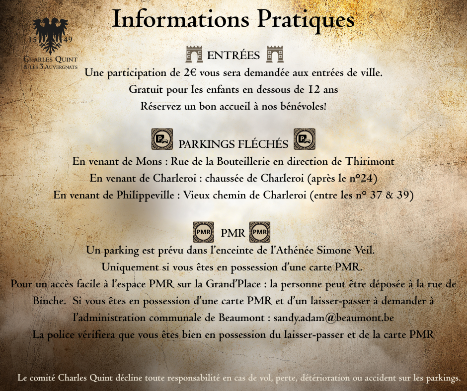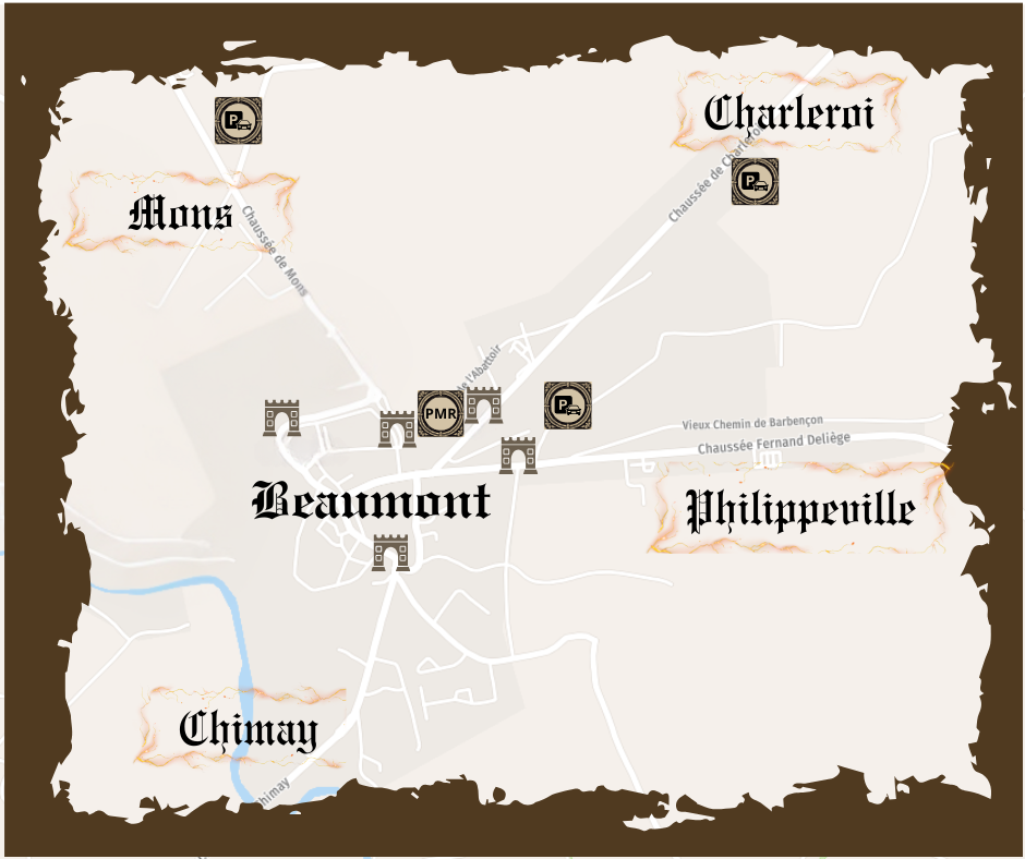 Espace PMR surélevé et laisser-passer accessible sur demande à sandy.adam@beaumont.be Parking : 2 parkings PMR mis à disposition gratuitement (Fléchage via Route de Mons et Route de Philippeville)